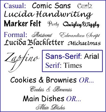 Above are some examples of casual and formal fonts. The kind of font you choose will help set the tone of your cookbook. Using a formal font for a cookbook with a wedding theme would look terrific, and a casual font would be appropriate for a family reunion depending on your family. I used Lucida Handwriting for my accent font, and Arial for the body. Incidentally, in the graphic above, the names of the various fonts are all the same point size, 24. Thats another thing to consider: some fonts are remarkably different in size even when you select the same size for all of them. Art The art you choose should be from a similar family, or it will be distracting. The examples below are from three different sets, or families, of (royalty free) clip art.